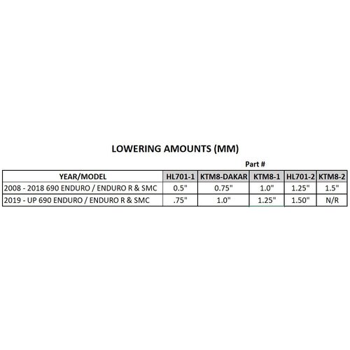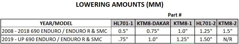 - Lowering amounts indicate REAR lowering, NOT overall bike height.
