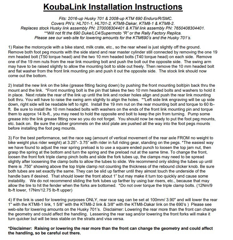 KoubaLink specialises in motorcycle lowering and performance linkages for off-road and dual-sport rear suspension systems. Compromise is not an option at KoubaLink. Listening to riders from all over the world explain where and how they use their off-road and dual-sport bikes. With their input, Koubalink manufacture products that add to your motorcycling experience and make it a little more enjoyable.
