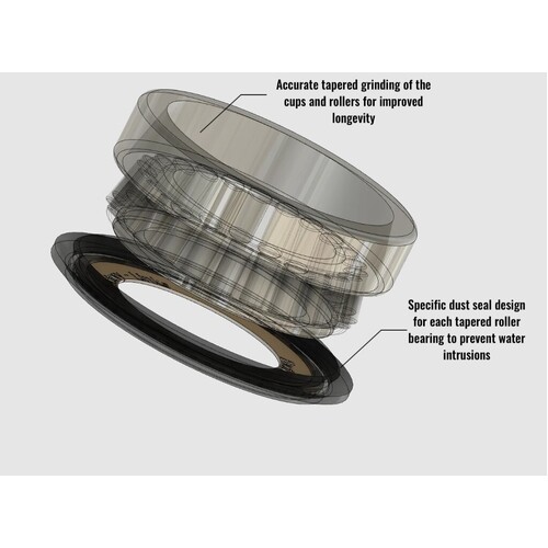 Our premium kits contain all elements required for a full OEM quality service of your steering stem. Our dedicated off-road design of tapered bearings and dust eals are specifically manufactured in order to reach the stringent OEM quality requirements, in terms of materials, dimension tolerances, hardness and surface roughness.