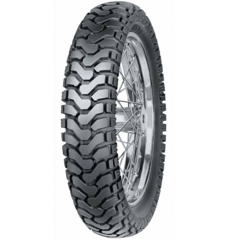 Mitas offers a wide range of versatile competition grade tyres with a high level of performance on a wide range of terrains. This E-07 is definitely one of them with its cross-ply construction and chevron tread pattern giving you grip on both pavement and the roughest terrain. Whilst still offering the well known Mitas long wear and durability. Mitas E-07 ENDURO is designed as a 50/50 dual sport – trail – adventure bike tire (50% on-road & 50% off-road use). It is an M+S (Mud+Snow) approved tire. Although many years on the market, it remains one of the most desirable choices of adventure riders, as it perfectly combines riding characteristics and mileage with off-road capability. The hardwearing compound and optimal performance, both on-road and off-road, make the E-07 a preferred choice on many journeys across the world. Selected sizes are available in the Dakar version (yellow stripe marking) featuring a stronger carcass and higher puncture resistance. Ideal for higher loads, long-distance adventure trips and extreme conditions. FEATURES 50% street / 50% dirt Chevron tread pattern Long-distance all-rounder DOT approved