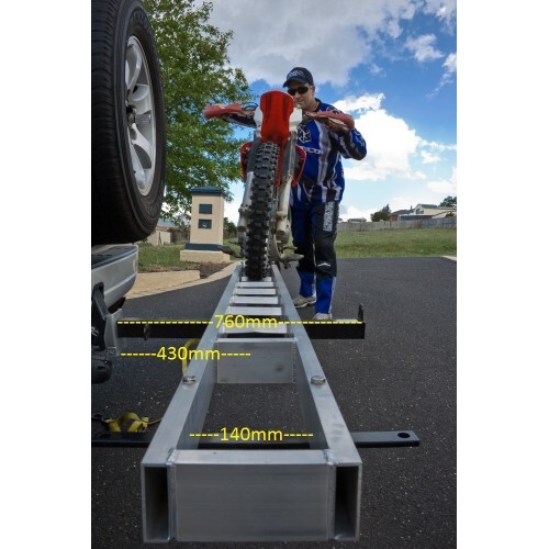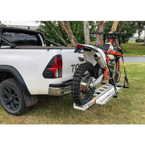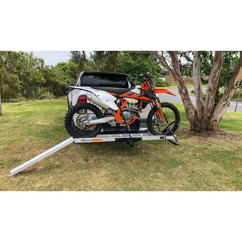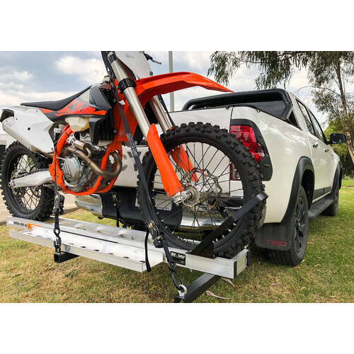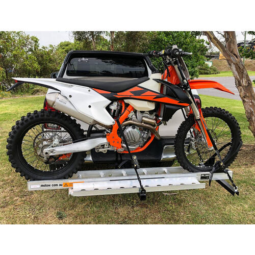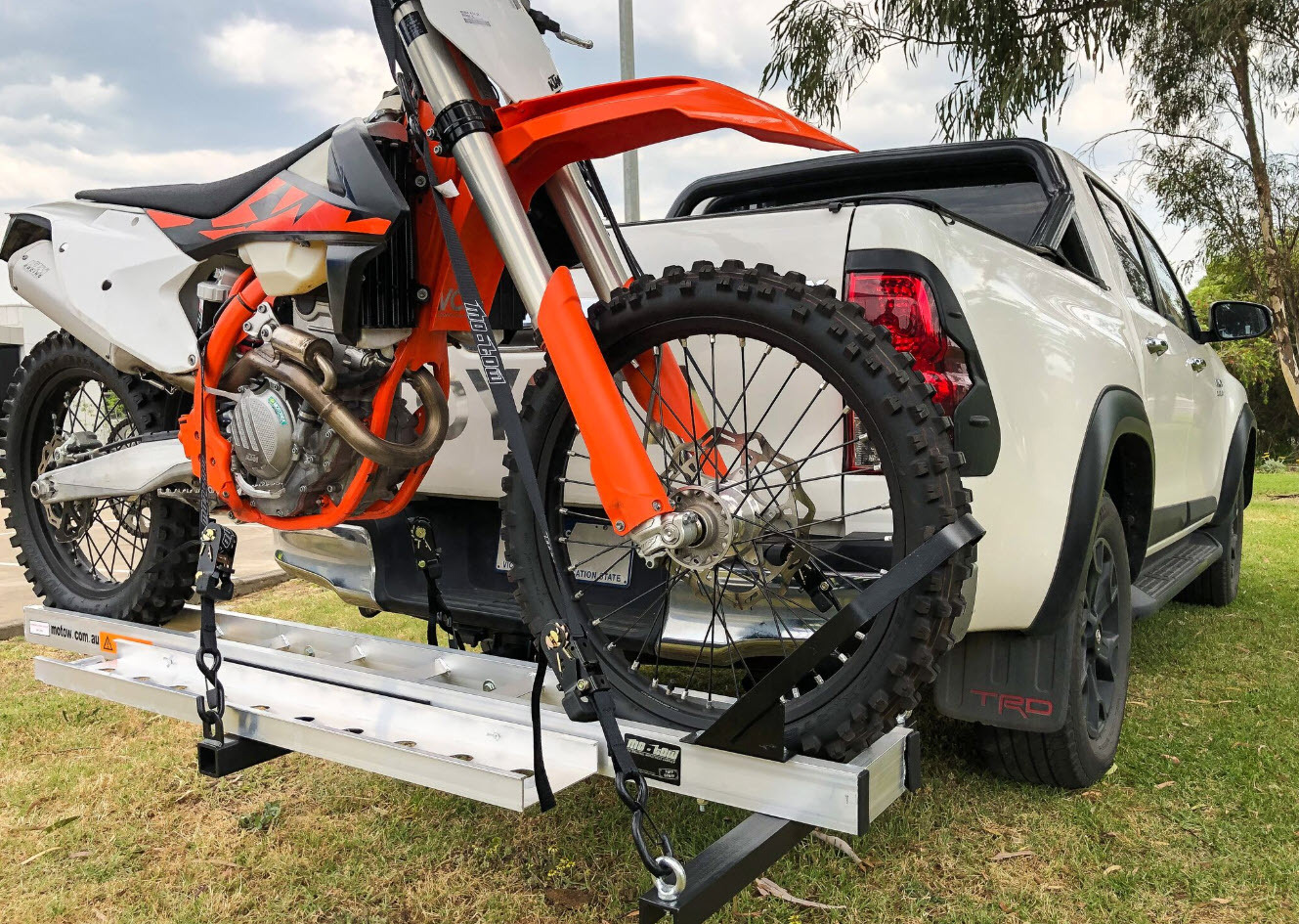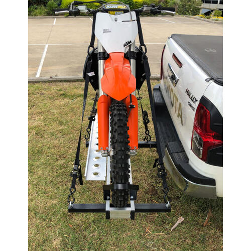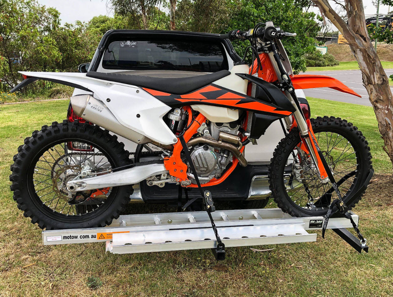 If you have ever thought of owning a trail bike and couldn't justify the cost of a traditional motocross trailer or don't have the room for one then mo-towâ„¢ is for you. Even if you do have a motocross trailer, at times you may only have a single bike to carry so why drag that big trailer around. Just walk your bike up the ramp and use the tie down points on the mo-towâ„¢ to secure your bike. Number plates and tail lights may be required depending on the visibility of both after the bike is mounted to your vehicle. Tie downs are not supplied and should be fitted correctly as with any bike carrier. It is recommended to use 4 tie-downs. Tie downs are available for purchase separately.