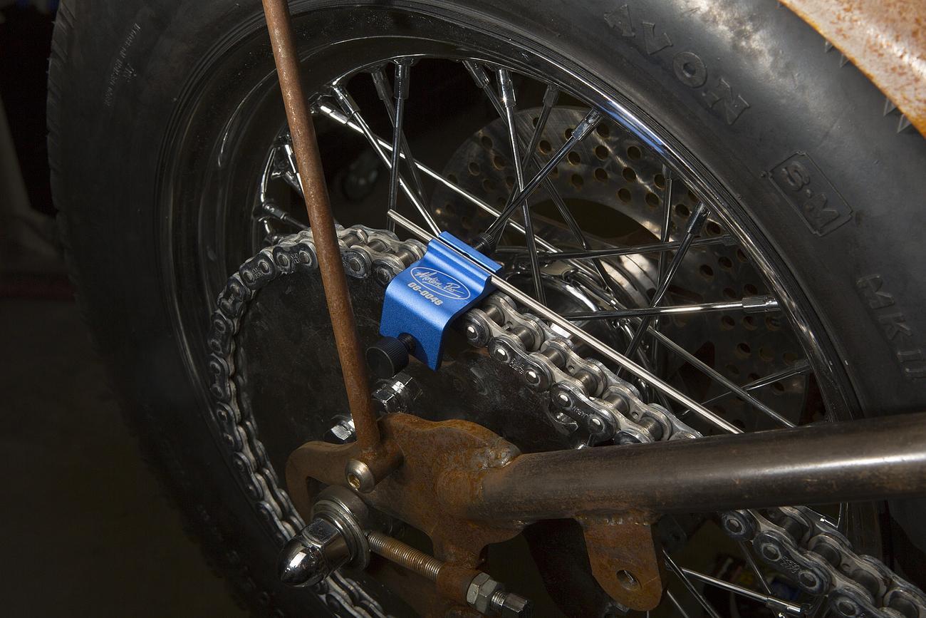 - Tool body clamps squarely to rear sprocket so the alignment rod will indicate sprocket alignment to chain
