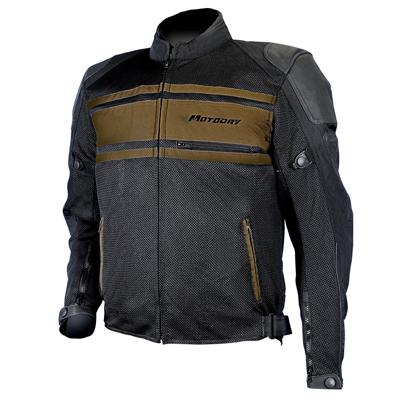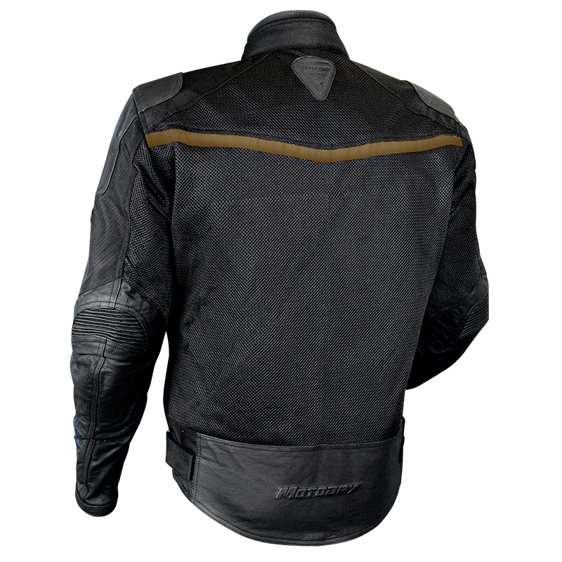 (SUMMER MESH) - Combination Leather / Mesh / Textile Construction - 600D H/Duty Abrasion Resistant Material Active Air Power-Mesh Panels - Genuine Leather Reinforced Shoulder / Elbows & 1000D Reinforcement - Zip out W/Proof Lining - Zippered Top Pocket - Provision for Clip In Optional Thermal Lining - Safety CE Shoulders/Elbows Protection & HDF Back Protector (Removable) - Soft Feel Collar - Zip/Snap Cuff Closure - Ribbed Elbow for Extra Comfort - Long Padded - Genuine Leather Kidney Panel - Genuine YKK Zips - Night Safety Reflective - Adjustable Arm Straps / Waist - Large Water Resistant Lower Pockets