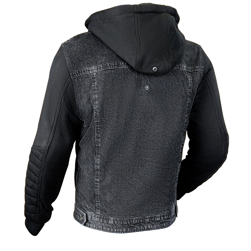 (WINTER) - Riding garment lining made with Kevlar- fiber - Lining in back, shoulders & elbow areas, made with Kevlar- fiber - Safety CE Protection Pack (Shoulder & Elbows) Removable & HDF Back Protector - Washed Black Denim (HID Cotton) + Soft Hoodie Materials - Urban style & protection - Internal Storage & Phone Pocket (Not W/Proof) - Subtle Blackout Night Safety Reflectors - Zip-off Hoodie (with Clip-Down Feature) - Ribbed Cuffs & Elastic Thumb Loop - Not Waterproof