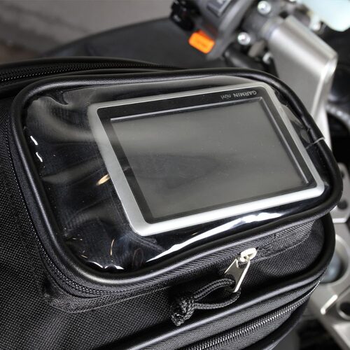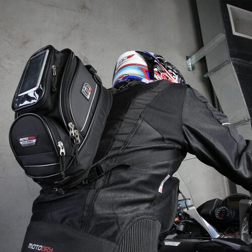 MINI Heavy Duty Reinforced 600 Denier material (PU backed) stylish modern design Expandable to 12 litres Internal easy see through storage pocket and key clip Includes extra strong Rare Earth Neodymium magnets for extra non-slip security Mobile phone or GPS storage pocket Use with backpack straps or with shoulder strap (multi- use easy) Storm/rain covers included 3M Scotchlite reflective for added night safety Non-slip tank bag base to help eliminate tank scratches Steering head security strap 220H X 180W X 320L X 250Top L (mm) Before Expanding