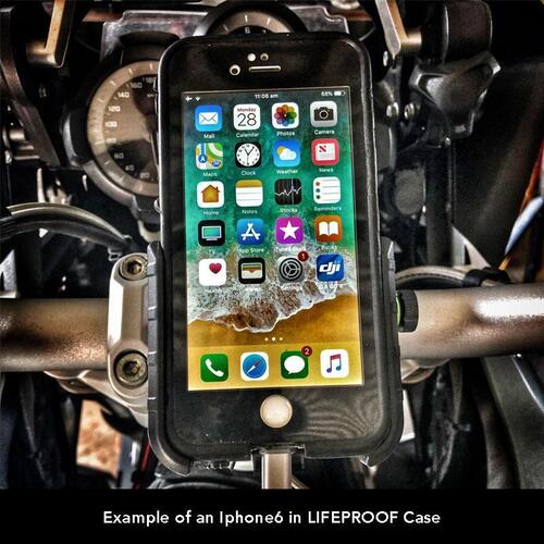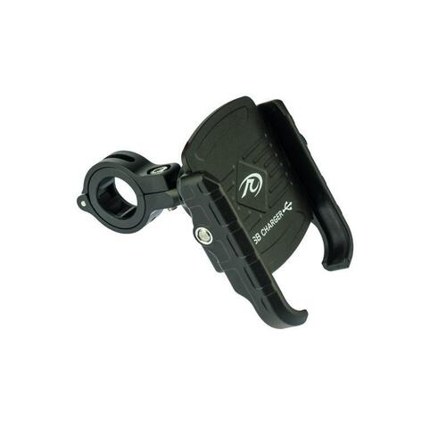 Attach the mount to a *ROUND handlebar with a diameter of 22 to 32mm, connect the mount to your battery, red to positive (+), black to negative (-) and you have power. The mount has a 5V/2.5A USB charge port, an ON/OFF switch and comes with a free USB cable suitable for charging Apple and SOME Samsung phones.