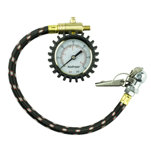 MotoPressor Tyre Gauge now comes standard with two chucks. A straight chuck for "easy to get at" valve stems PLUS a 45? chuck for those "not so easy to get at" valve stems.