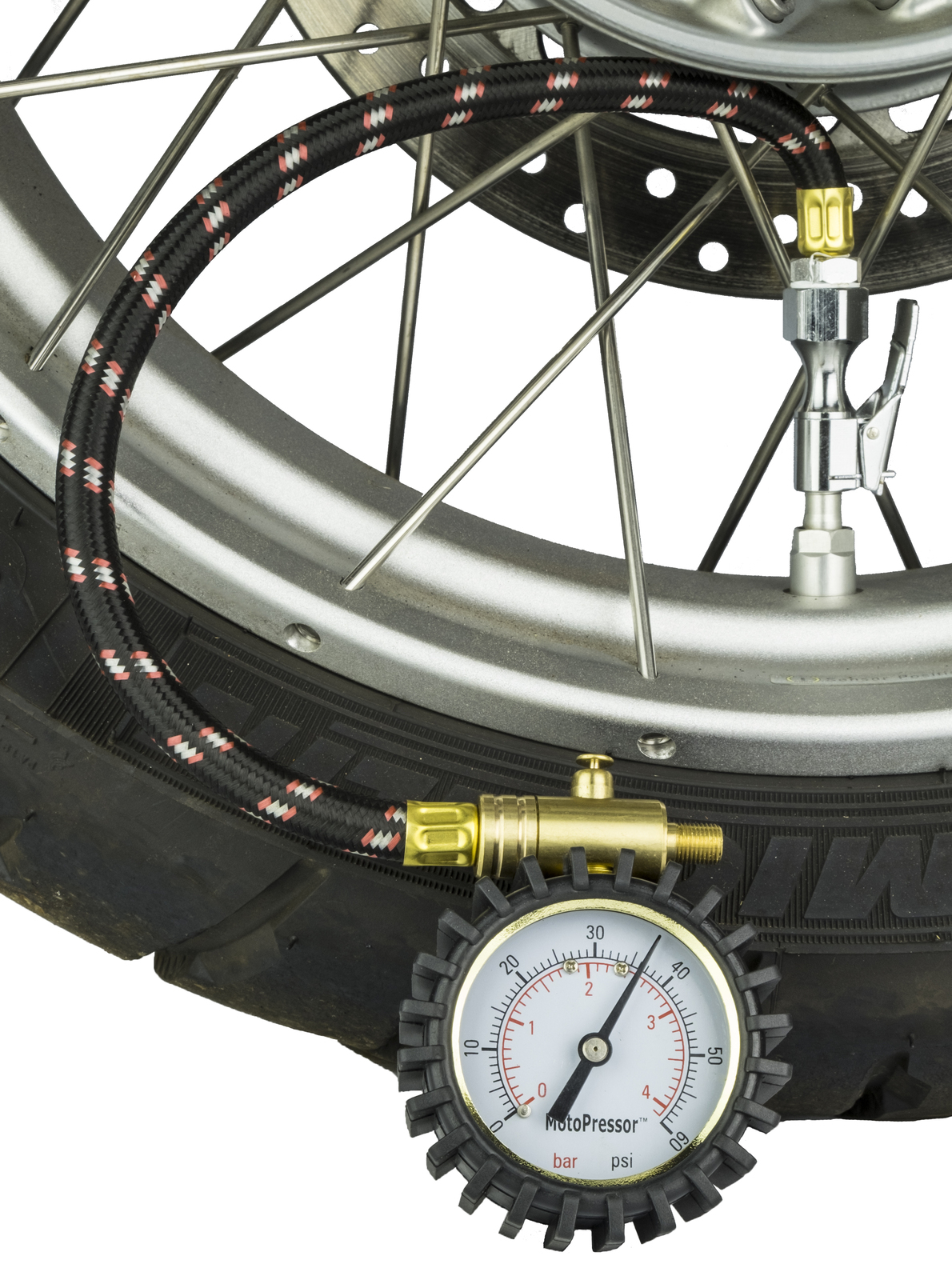 We all know what a pain Petrol Station gauges are. Most are woefully inaccurate and impossible to get onto a motorcycle valve stem. To use the MotoPressor Tyre Gauge with Petrol Station gauge, simply attach the MotoPressor Tyre Gauge to your valve stem, attach the petrol station chuck to the inline fitting on the gauge and get an instant and accurate reading in PSI or KPA.