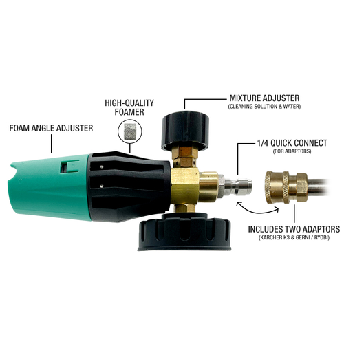 - Includes 1/4 Quick Connect + Karcher K3 + Gerni / Ryobi Adaptors