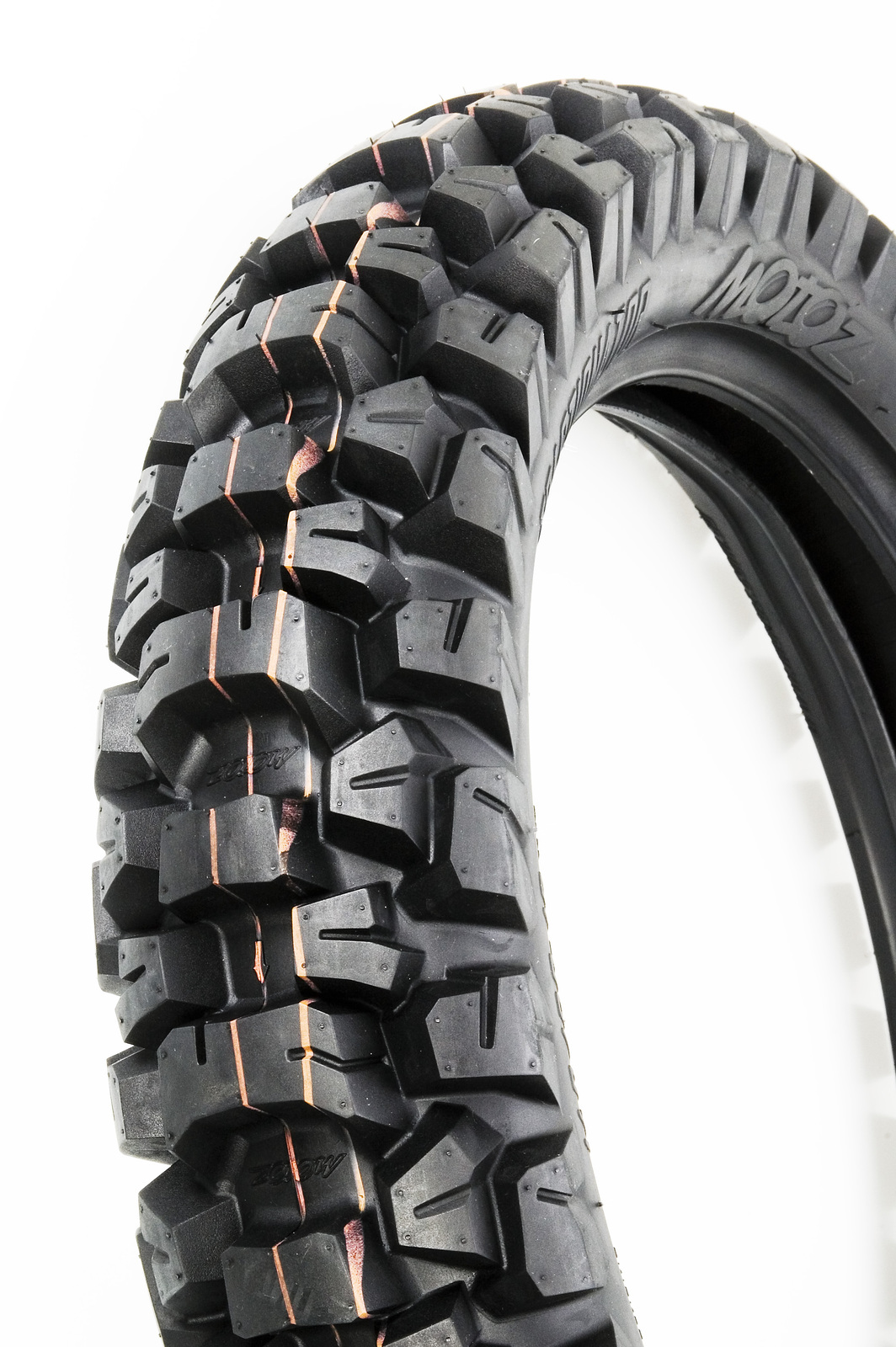Motoz Tractionator Desert Hard Terrain Tyres are intended for intermediate-hard terrain and rally use, and cross over into adventure use very well. They offer long wear life and excellent traction in varied terrain, and are like a special desert race tyre without the expense. They excel in high speed wide open throttle cornering, deceleration/engine braking into fast corners, fast rocky fire trails and multi day rides where long tyre wear is essential. Tractiontor Desert H/T. DOT homologated. Works well on heavy bikes.