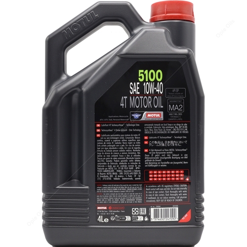 Motul 5100 4T 10w-40 is a high performance, Technosynthese synthetic engine lubricant based on Ester-Technology. IT features anti-wear properties and improves gear protection and life time. This standard viscosity grade is recommended by motorcycle manufacturers worldwide.