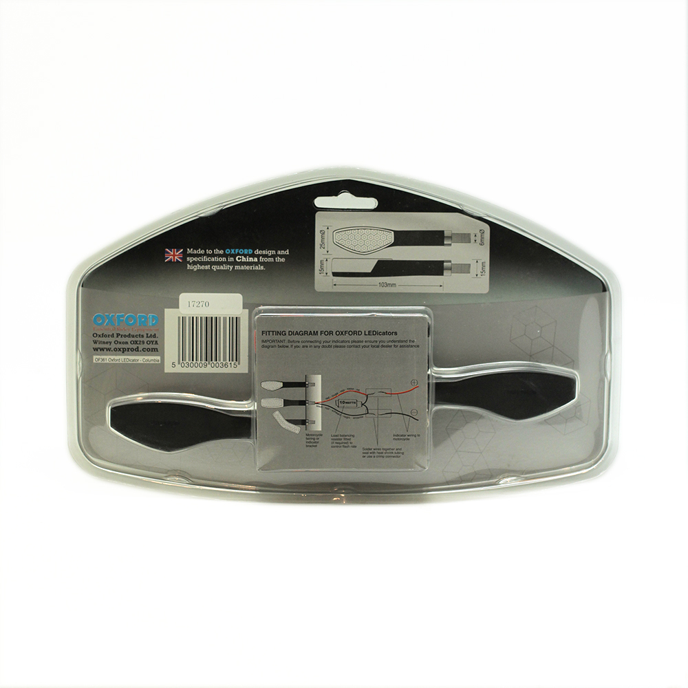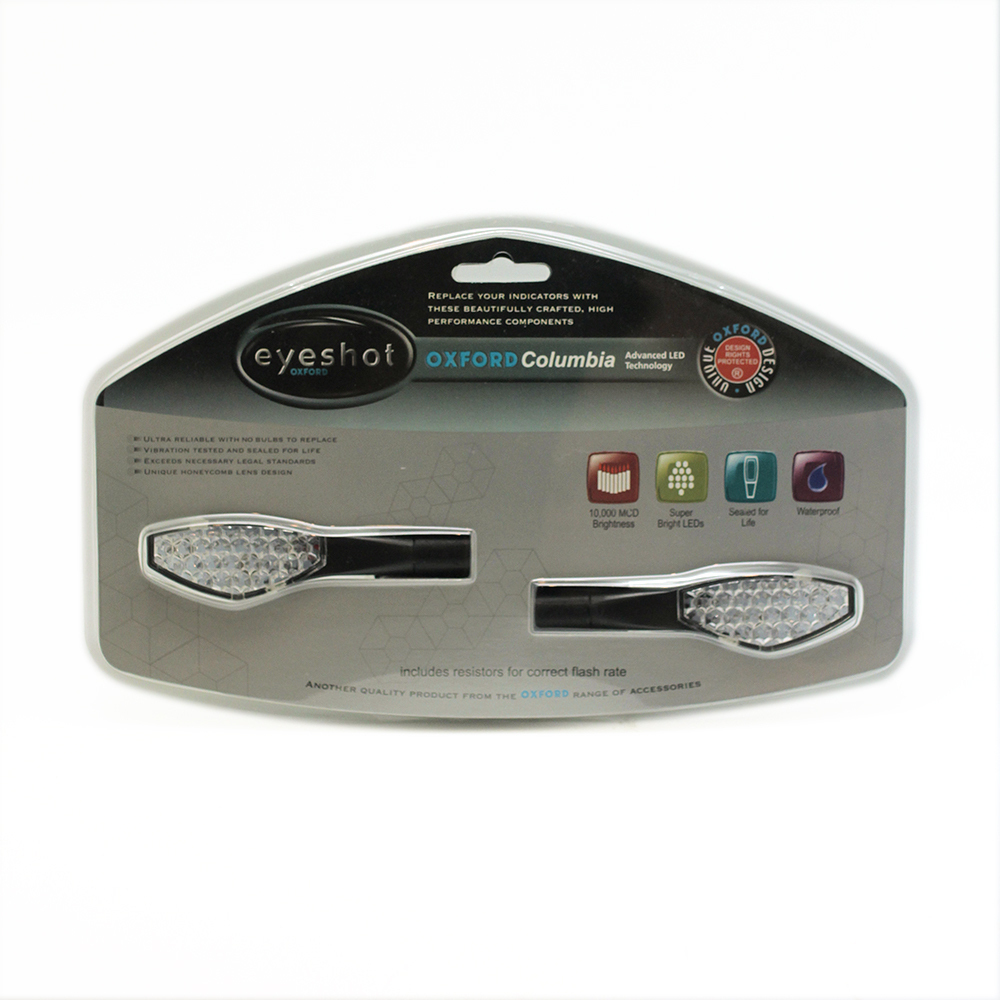 Replace your standard indicators with these beautifully crafted, miniaturized, high-performance components. Their remarkable 10,000MCD (1000 candle power) or 150,000MCD for the Oxford Nano of lighting energy is optimised by a new 'Honeycomb' lens technology, helping to maximise your visibility when manoeuvring. As well as their bespoke design and enhanced performance, Oxford Eyeshot LED indicators boast a much longer life-span than conventional bulb-lit indicators, so you can spend more time enjoying your bike and less time maintaining it.