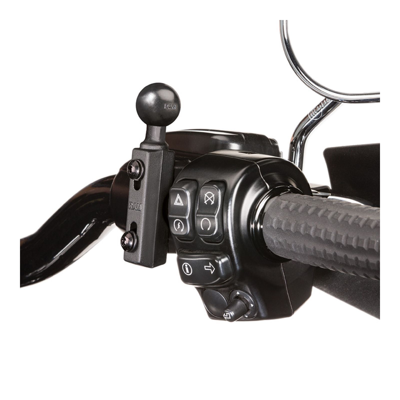 The RAM-B-309-1U attaches to your motorcycle's handlebar clutch/brake clamp and features one B size 1" rubber ball. The base fits the control clamps on your motorcycle with 40mm x 6mm stainless steel hardware, provided in the kit. To see if the RAM-B-309-1U base is compatible with your motorcycle, check the hole spacing of the base against your clutch/brake reservoir. The hole centers have a minimum width of 0.94" and a maximum of 1.58".