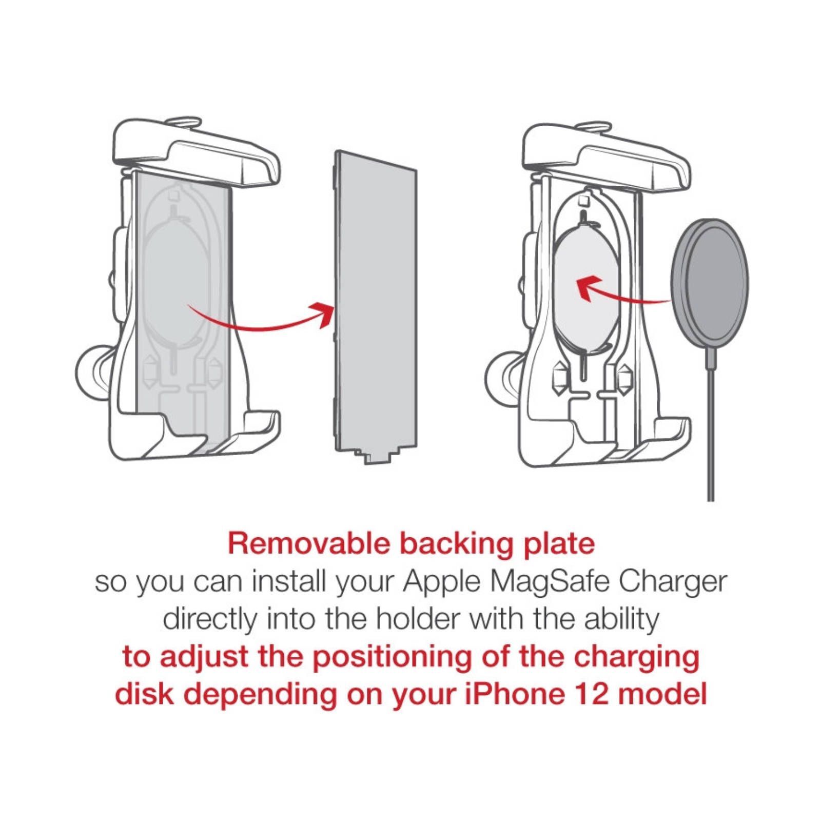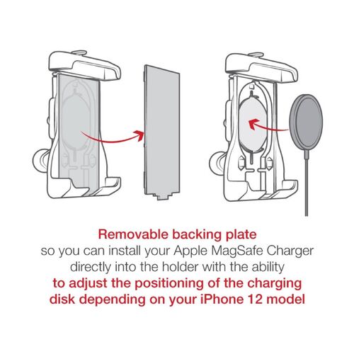 The RAM® Quick-Grip™ product line gets an Apple MagSafe Charger compatible insert. Designed specifically to fit the official Apple MagSafe Charger, this RAM® Quick-Grip™ phone holder has a removable backing plate so you can install your Apple MagSafe Charger directly into the holder with the ability to adjust the positioning of the charging disk depending on your iPhone 12 model iPhone. This insert allows a perfect and secure fit for the MagSafe's charging disk and is only compatible for the iPhone 12, 12 Pro, 12 Pro Max, and 12 mini with or without an official Apple MagSafe case.