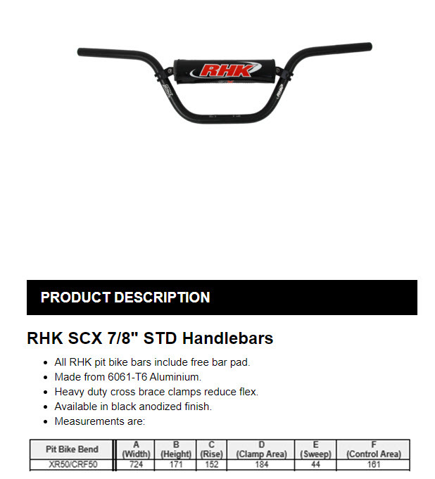 RHK CRF50 XR50 PRO TAPER REPLICA BEND SCX 7/8 HANDLEBARS BLACK - SUITS KLX110 CRF70