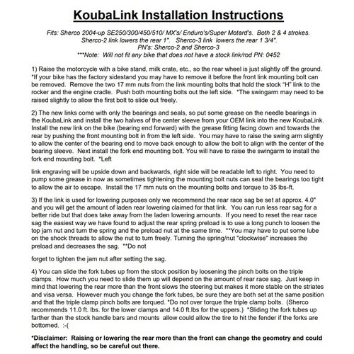 KoubaLink specialises in motorcycle lowering and performance linkages for off-road and dual-sport rear suspension systems. Compromise is not an option at KoubaLink. Listening to riders from all over the world explain where and how they use their off-road and dual-sport bikes. With their input, Koubalink manufacture products that add to your motorcycling experience and make it a little more enjoyable.