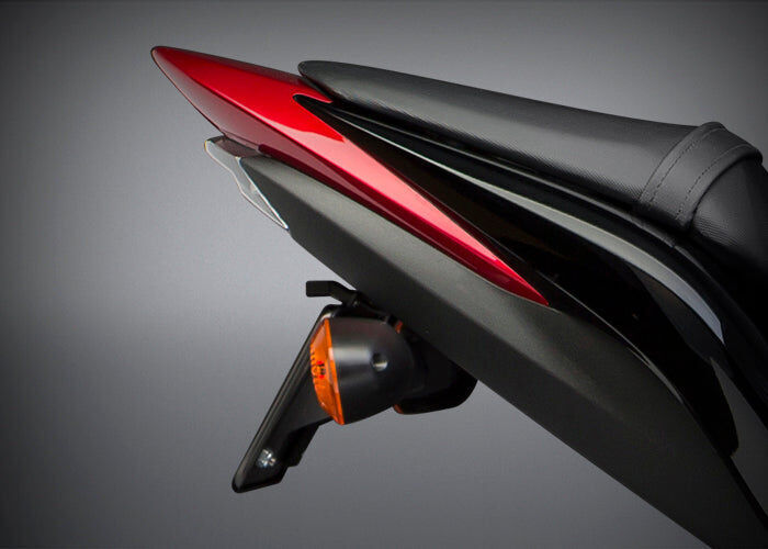 Model specific precision laser-cut stainless steel bracket tucks discreetly under the tail section of the motorcycle