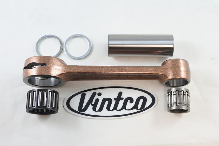 VintCo has all-new heavy-duty connecting rod kits for your vintage Suzuki dirt bike that will get you back on track. These connecting rod kits will save you money over a new crankshaft. This connecting rod kit fits all 1979-80 RM125, 1979-81 MR100 and 1969-1977 A100 models. All connecting rod dimensions/measurements are online with pictures. VintCo rod kits are manufactured with Heavy Duty Forged Steel and made with modern materials and manufacturing techniques to ensure as good or better than OEM fitment and performance. The Kit includes a rod, crank pin, big end bearing, wrist pin bearing, and two thrust washers. This newly manufactured connecting rod kit from VintCo will help you keep the ride going!