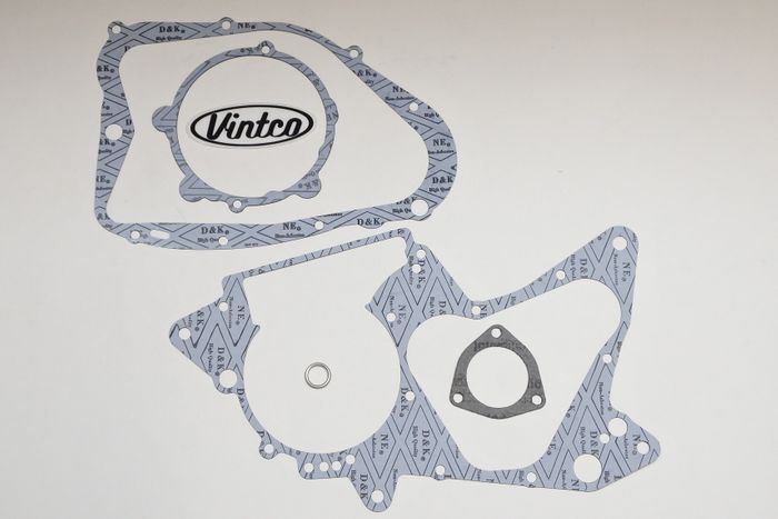 VintCo has all new engine gasket kits to help on your engine lower end rebuild. These gaskets are made with modern materials and manufacturing techniques to ensure an as good or better than OEM fitment and performance. The OEM part numbers are provided as a reference to ensure exact fitment. This kit fits all 1976-78 Suzuki RM125 and 1977-79 PE250 models. This engine gasket kit includes the crankcase gasket, clutch cover gasket, magneto cover gasket, exhaust gasket, and drain plug gasket to complete your build with ease. These newly manufactured gaskets from VintCo will help you keep the ride going!