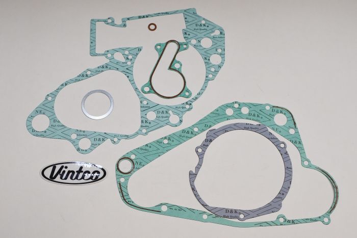 VintCo has all new engine gasket kits to help on your engine lower end rebuild. These gaskets are made with modern materials and manufacturing techniques to ensure an as good or better than OEM fitment and performance. The OEM part numbers are provided as a reference to ensure exact fitment. This kit fits all Suzuki 1989 RM250 and 1989 RMX250 models. This engine gasket kit includes the Crankcase gasket, clutch cover gasket, magneto cover gasket, exhaust gasket, water pump case gasket, and drain plug gasket to complete your build with ease. These newly manufactured gaskets from VintCo will help you keep the ride going!