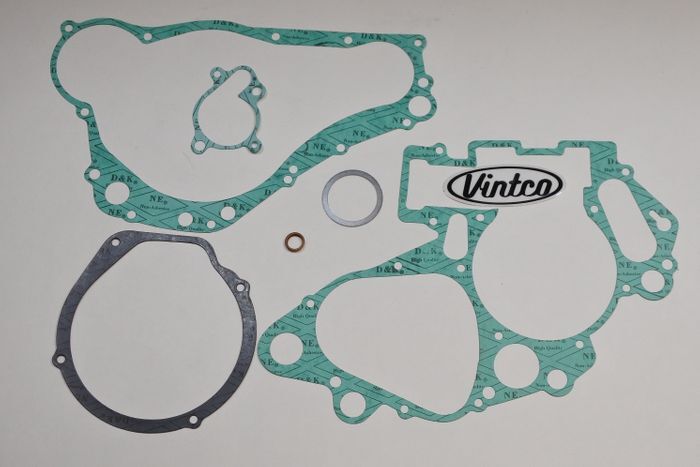 VintCo has all new engine gasket kits to help on your engine lower end rebuild. These gaskets are made with modern materials and manufacturing techniques to ensure an as good or better than OEM fitment and performance. The OEM part numbers are provided as a reference to ensure exact fitment. This kit fits all 1994-95 Suzuki RM250 models. This engine gasket kit includes the crankcase gasket, clutch cover gasket, magneto cover gasket, exhaust gasket, water pump case gasket, and drain plug gasket to complete your build with ease. These newly manufactured gaskets from VintCo will help you keep the ride going!