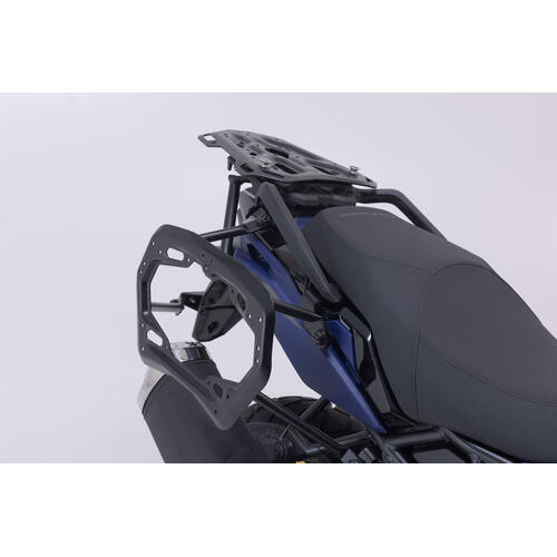 The Adventure set Luggage contains PRO side carriers to fit the Aprilia Tuareg with the matching ADVENTURE-RACK. The side carrier and rack are fastened to the bike-specific attachment points and offer sturdy support for the black TRAX ADV aluminium cases.
