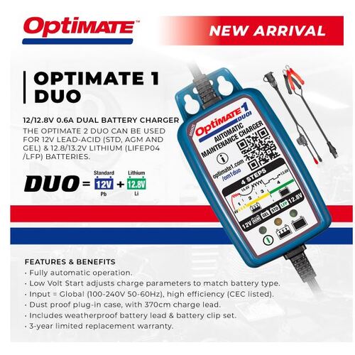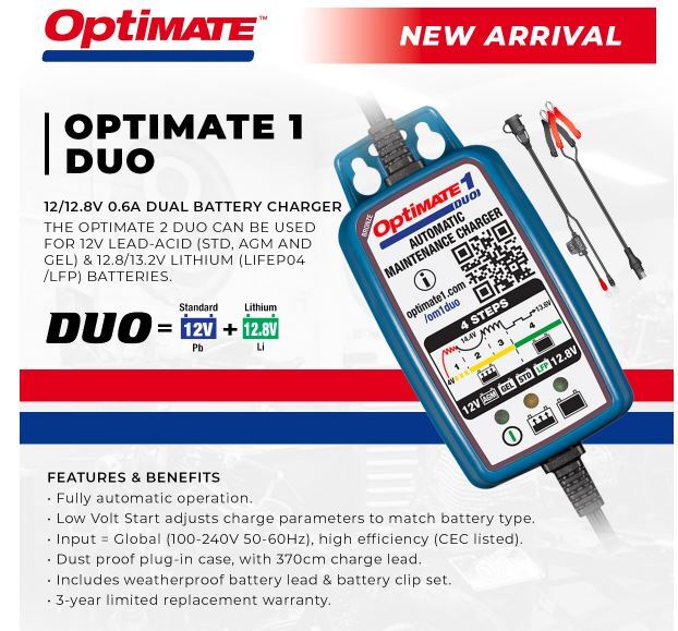 TecMate Optimate 1 DUO - Lithium and Lead Acid Smart Battery Charger 0.6amp (STD, GEL & AGM)
