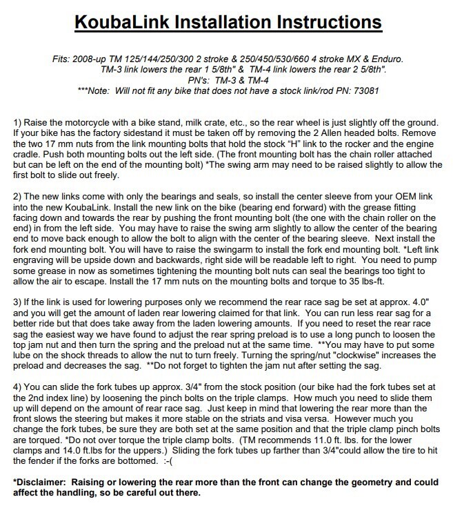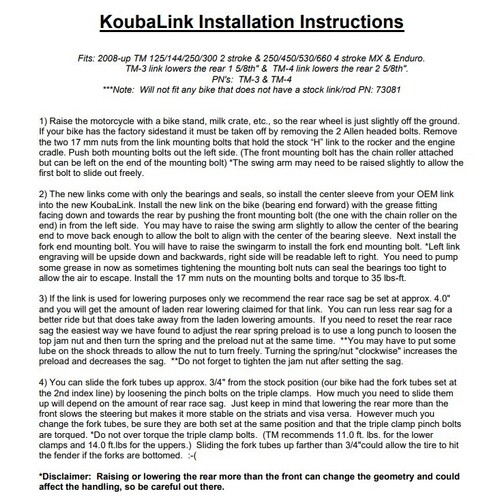 KoubaLink specialises in motorcycle lowering and performance linkages for off-road and dual-sport rear suspension systems. Compromise is not an option at KoubaLink. Listening to riders from all over the world explain where and how they use their off-road and dual-sport bikes. With their input, Koubalink manufacture products that add to your motorcycling experience and make it a little more enjoyable.