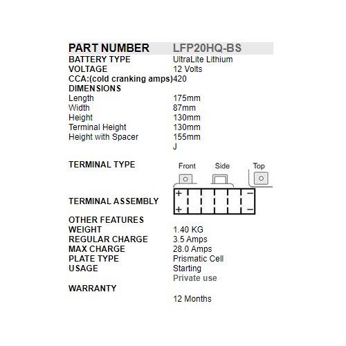 Unlike many other lithium batteries, SSB PowerSport Lithium Batteries are made using prismatic cells making them not only safe to use, but also boasts higher CCA (cold cranking amps), better cyclic properties and have a longer life. We are aware of only one other brand of lithium starting battery that uses prismatic cells. Other brands generally use cylindrical cells and while they may be a little cheaper due to lower manufacturing costs, they are inferior and are not designed for starting vehicles.​