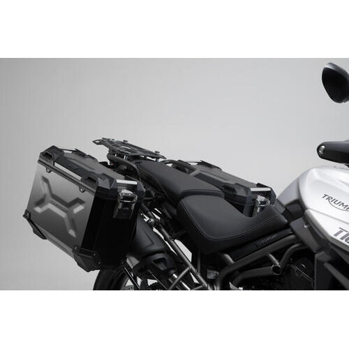 The Adventure set Luggage contains PRO side carriers to fit the Aprilia Tuareg with the matching ADVENTURE-RACK. The side carrier and rack are fastened to the bike-specific attachment points and offer sturdy support for the black TRAX ADV aluminium cases.