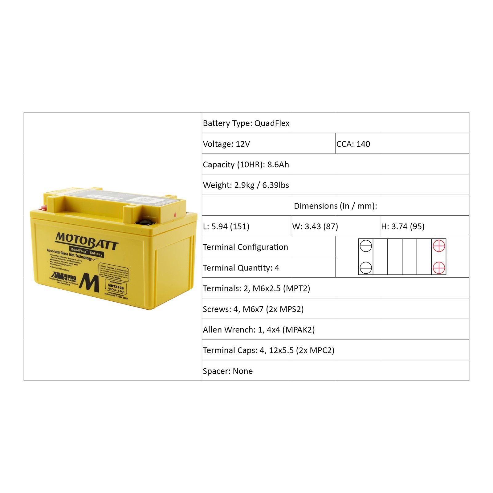 Motobatt batteries are manufactured from Absorbed Glass Mat (AGM), this design has revolutionised the motorcycle, ATV, lawnmower and small engine industry. QuadFlex provides a unique four-terminal design with two positives, two negatives along with height spacers that permit an almost universal fit. All Motobatt AGM Batteries are maintenance free, non-hazardous, non-spill, charged and ready to install directly out of the box.