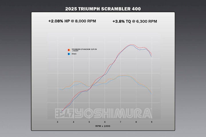 Our GP Magnum slip-on looks just perfect on the Scrambler 400. A weight savings of as much as 3 Lbs. is one thing, but the performance is another with a 2.08% increase of HP at 8000 rpm and a 3.8% increase in torque @ 6,300 rpm just nails it.