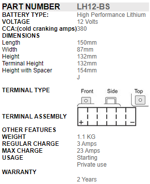 A normal lead acid motorcycle battery is designed to last for 200 300 cycles, whereas SSB PowerSport Lithium Batteries are designed to last for over 2,000 cycles (more than 10 Years design life). In addition, they can sit unused for over a year without losing charge and can also be charged extremely quickly without damaging the battery.