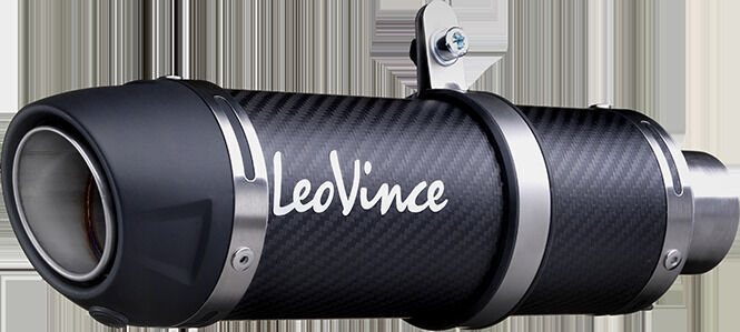 Dual layer of pre-preg Carbon FibreAISI 304 Stainless Steel internals and componentsSporty Technopolymer end capAISI 304 Stainless Steel fastening strap with rubber gasketAluminium Leo Vince logoMIG weldsHigh quality thermal resistant Fiberglass packing