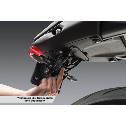 Model specific precision laser-cut stainless steel bracket tucks discreetly under the tail section of the motorcycle