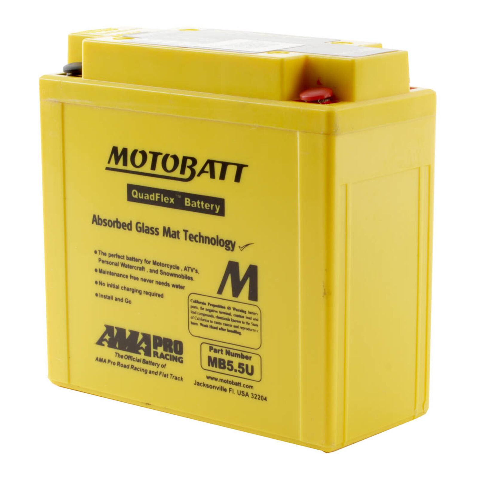 Motobatt batteries are manufactured from Absorbed Glass Mat (AGM) this design has revolutionised the motorcycle ATV lawnmower and small engine industry. QuadFlex provides a unique four-terminal design with two positives two negatives along with height spacers that permit an almost universal fit. All Motobatt AGM Batteries are maintenance-free non-hazardous non-spill charged and ready to install directly out of the box.