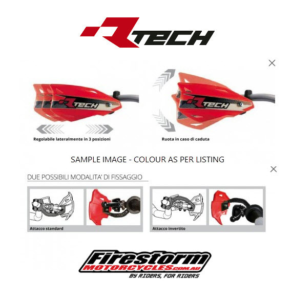 RTech Cross/Enduro Vertigo Handguards. The new RTech handguards with an attractive, modern design. Made with IPL technologies mounted independently from the brake and clutch perches with a large range to adjust up, down, left and right. Comes complete with universal plastic mounting kit 7/8" and 1 1/8" bars.