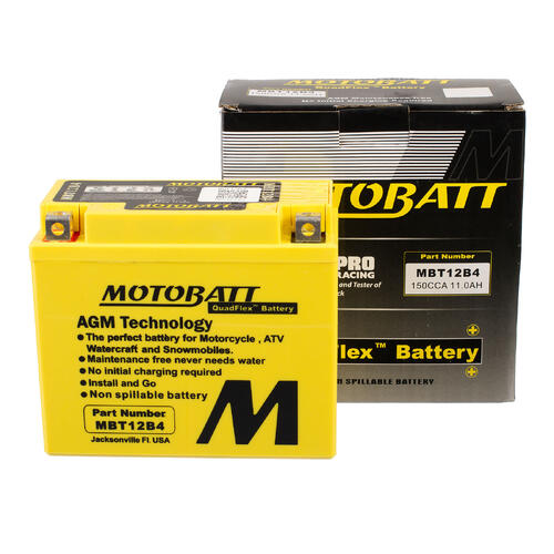 Motobatt batteries are manufactured from Absorbed Glass Mat (AGM) this design has revolutionised the motorcycle ATV lawnmower and small engine industry. QuadFlex provides a unique four-terminal design with two positives two negatives along with height spacers that permit an almost universal fit. All Motobatt AGM Batteries are maintenance-free non-hazardous non-spill charged and ready to install directly out of the box.