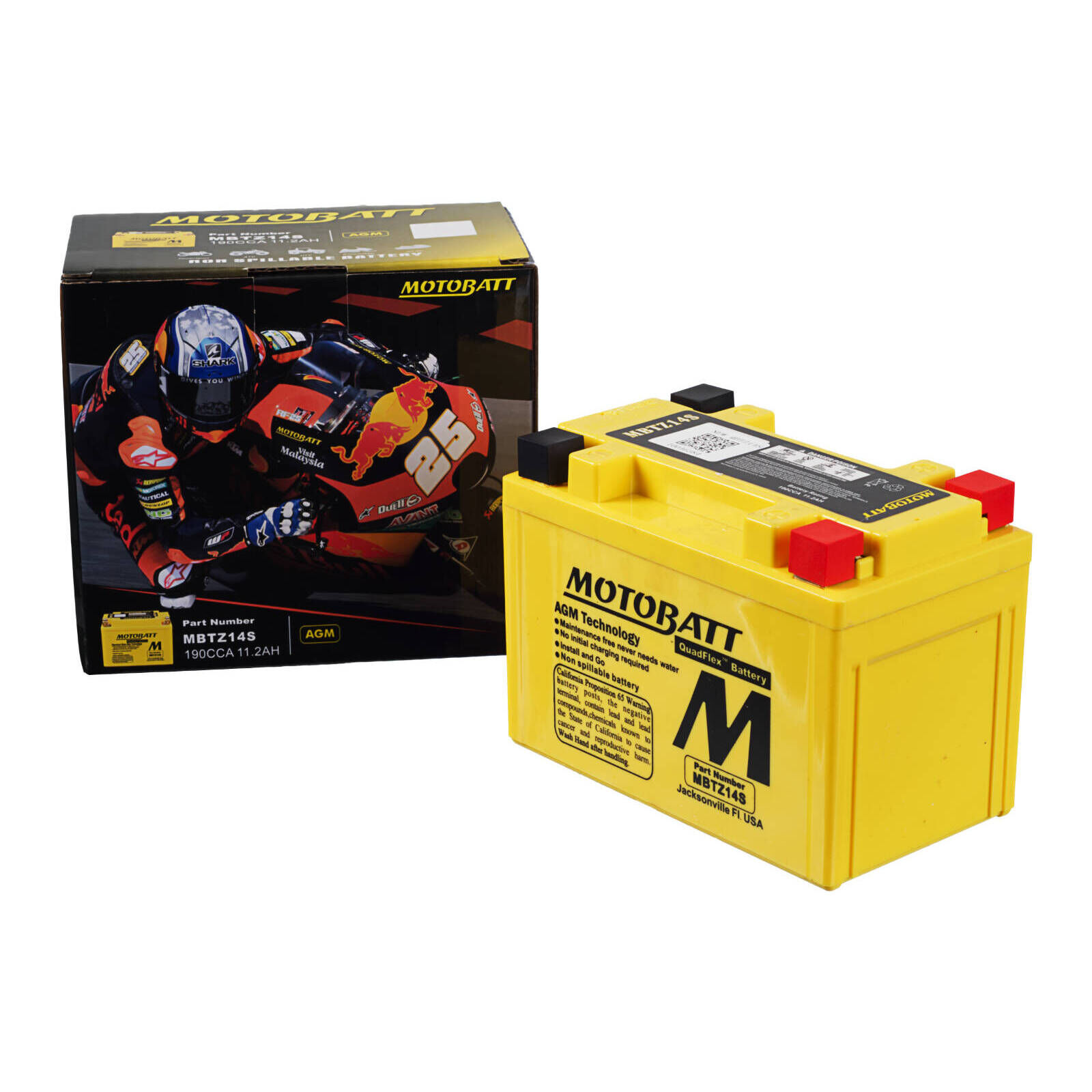 Motobatt batteries are manufactured from Absorbed Glass Mat (AGM) this design has revolutionised the motorcycle ATV lawnmower and small engine industry. QuadFlex provides a unique four-terminal design with two positives two negatives along with height spacers that permit an almost universal fit. All Motobatt AGM Batteries are maintenance-free non-hazardous non-spill charged and ready to install directly out of the box.