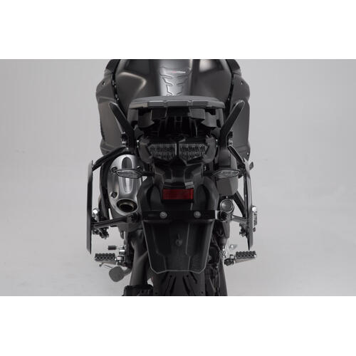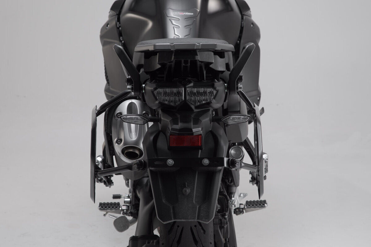 The Adventure set Luggage contains PRO side carriers to fit the Aprilia Tuareg with the matching ADVENTURE-RACK. The side carrier and rack are fastened to the bike-specific attachment points and offer sturdy support for the black TRAX ADV aluminium cases.