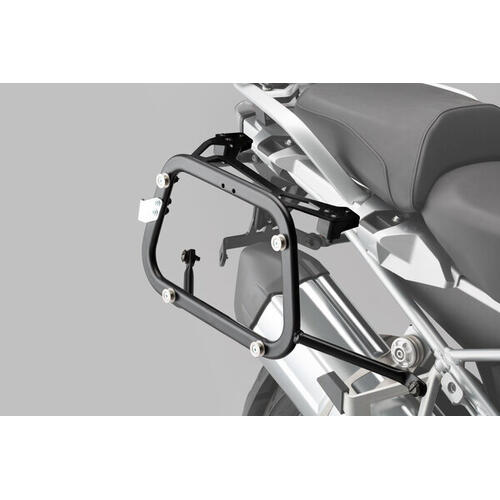 The Adventure set Luggage contains PRO side carriers to fit the Aprilia Tuareg with the matching ADVENTURE-RACK. The side carrier and rack are fastened to the bike-specific attachment points and offer sturdy support for the black TRAX ADV aluminium cases.
