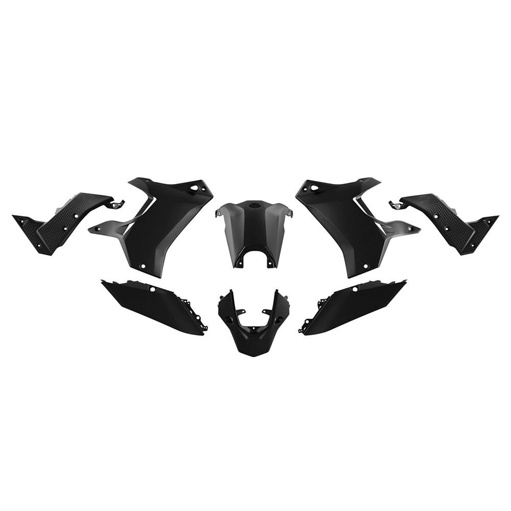 It is composed by two shrouds, gas tank cover, two central side panels, two rear number plate side panels and rear fender.