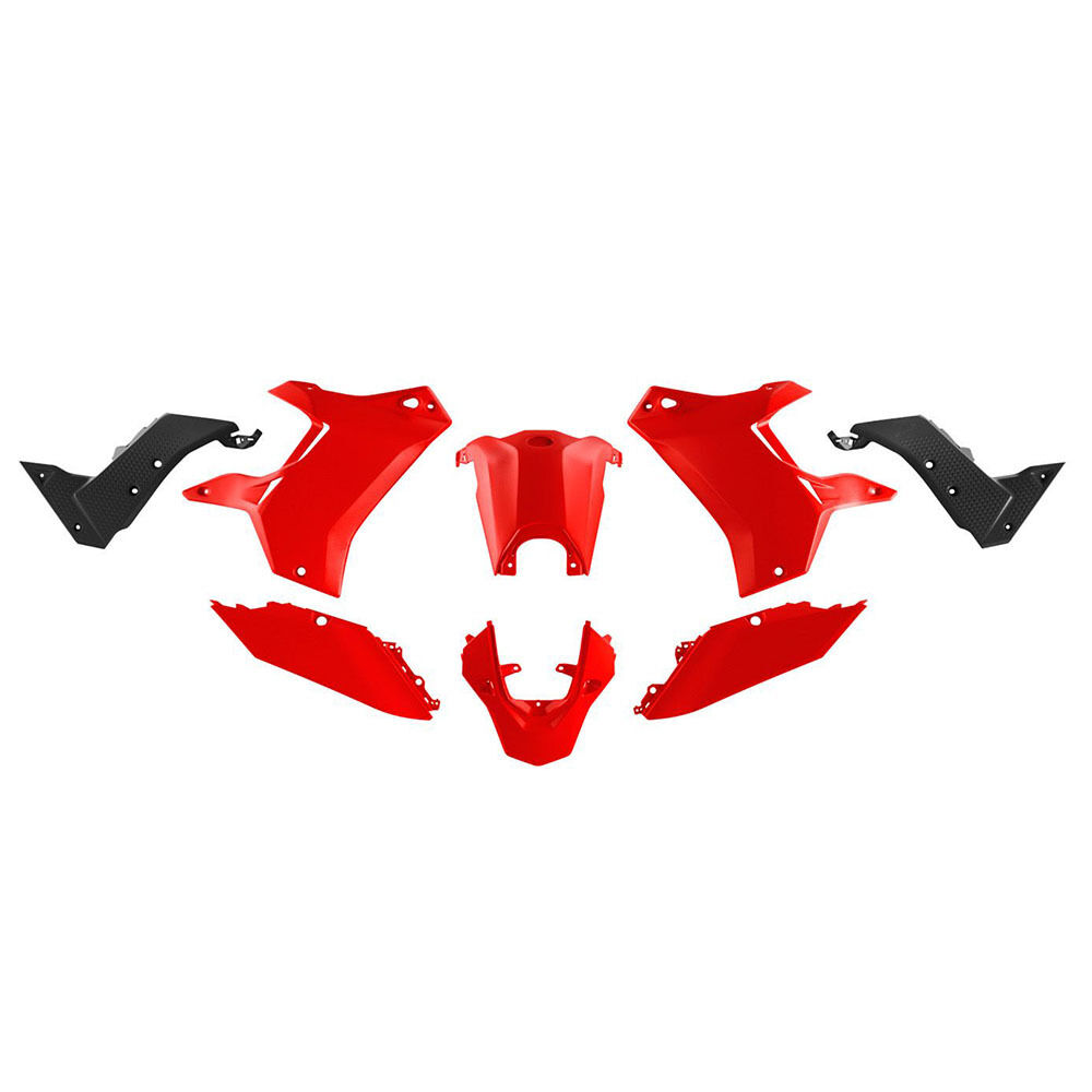 It is composed by two shrouds, gas tank cover, two central side panels, two rear number plate side panels and rear fender.