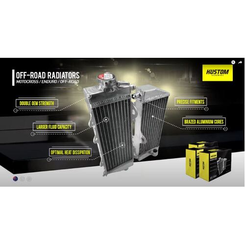 Kustom Hardware Radiators are specially designed and manufactured to withstand and exceed the demands of off-road riding. Highly efficient brazed aluminium cores allow for maximum heat dissipation, which provides ultimate protection under extreme riding conditions.
