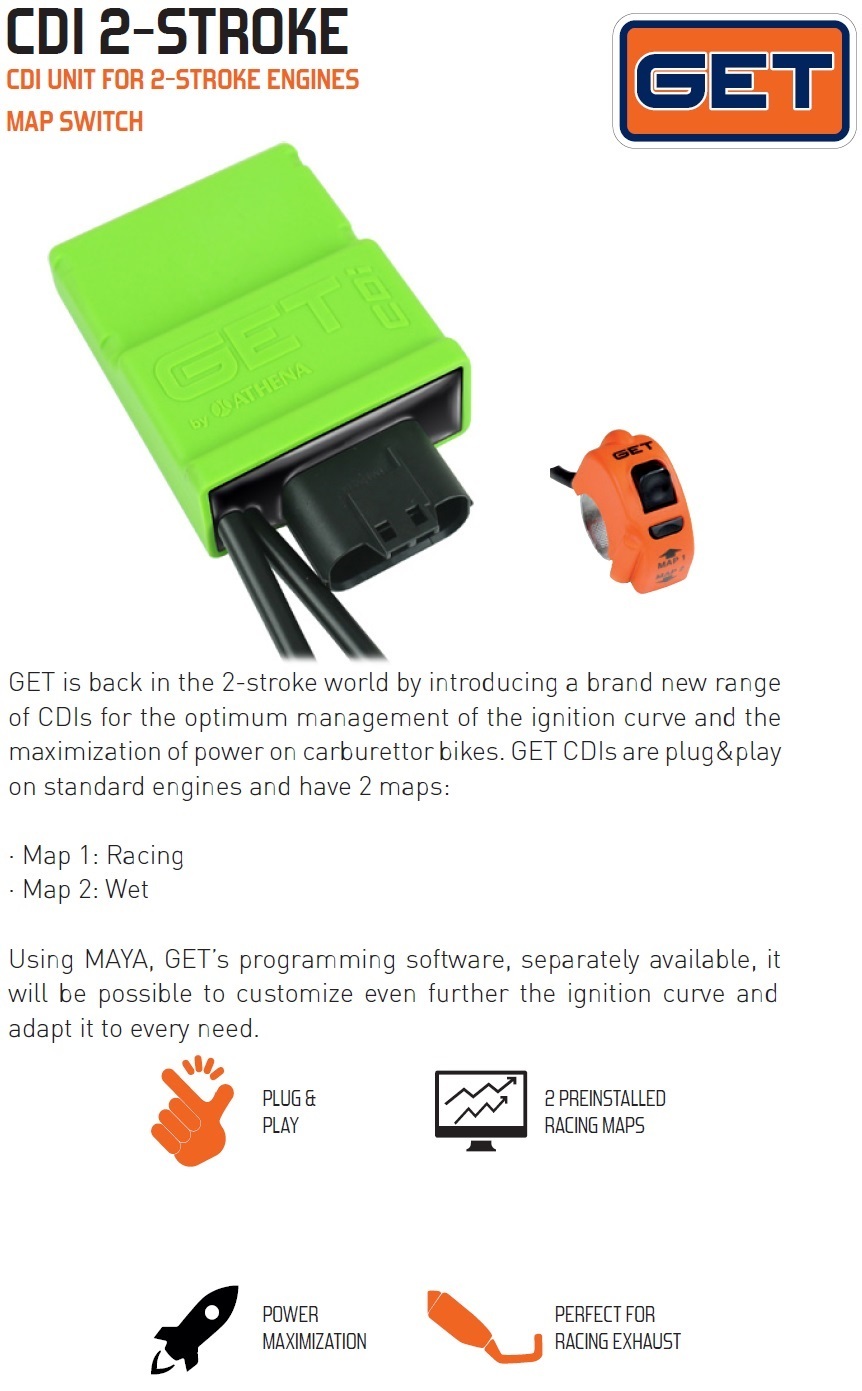 GET CDIs are plug & play on standard engines and have 2 maps, Map 1: Racing and Map 2: Wet. Via our MAYA software, separately available, it will be possible to customize even further the ignition curve and adapt it to every need.