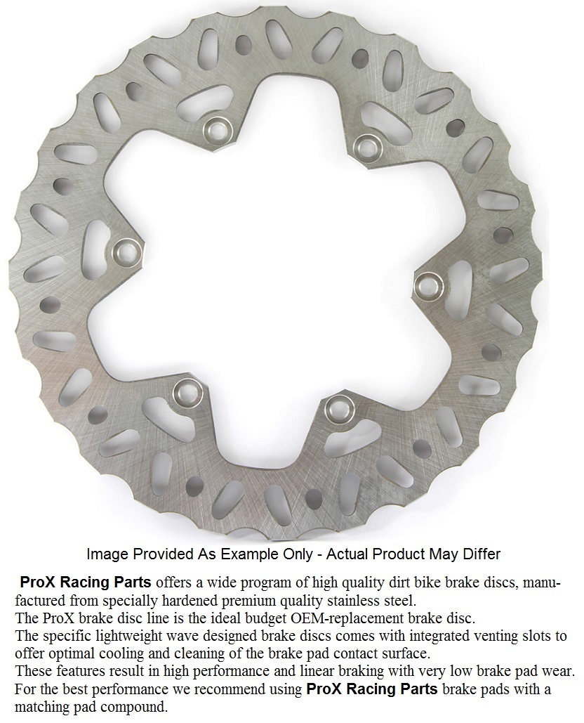 Pro-X Racing Parts offers a wide program of high quality dirt bike brake discs, manufactured from specially hardened premium quality Stainless Steel. The Pro-X brake disc line is the ideal OEM-replacement brake disc. The specific lightweight wave designed brake discs comes with integrated venting slots to offer optimal cooling and cleaning of the brake pad contact surface.