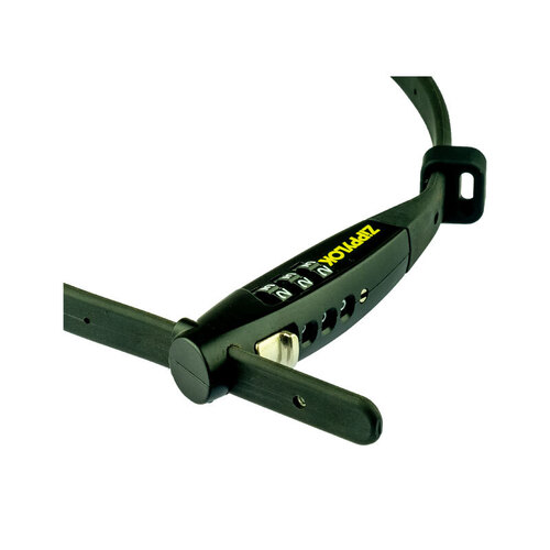 The ZIPPYLOK has an adjustable steel strap, 45cm long x 1cm wide, housed in an anti-scratch sheath. The combination lock is made of zinc alloy and will not rust.